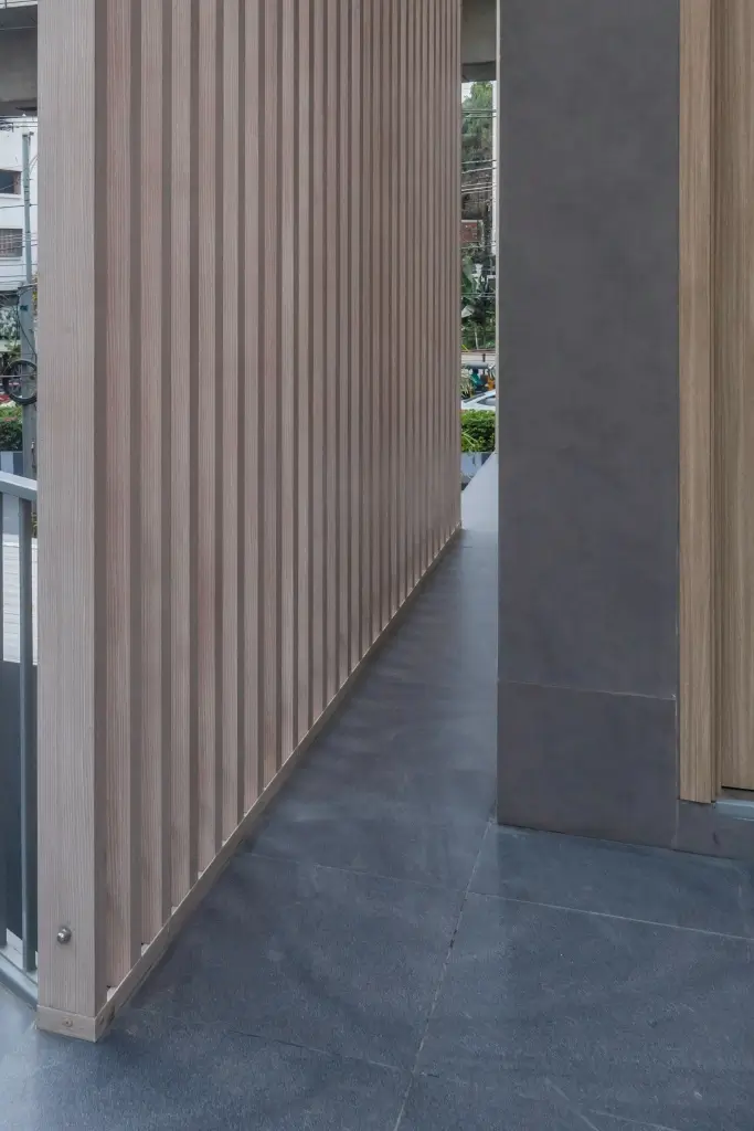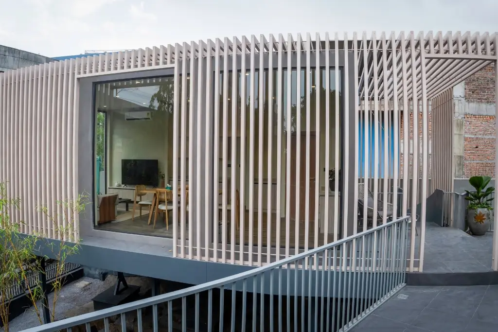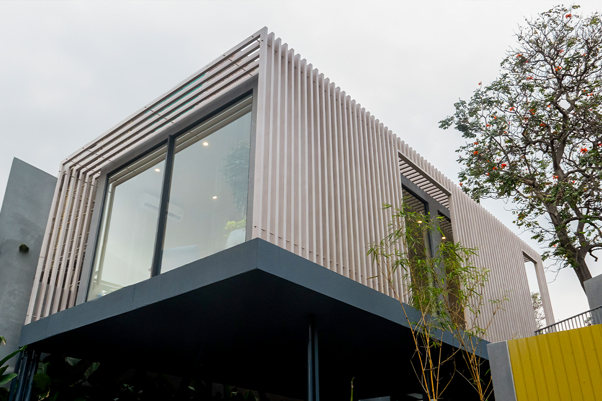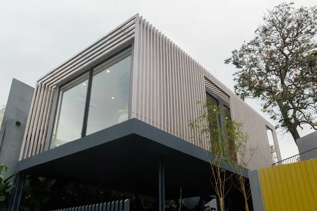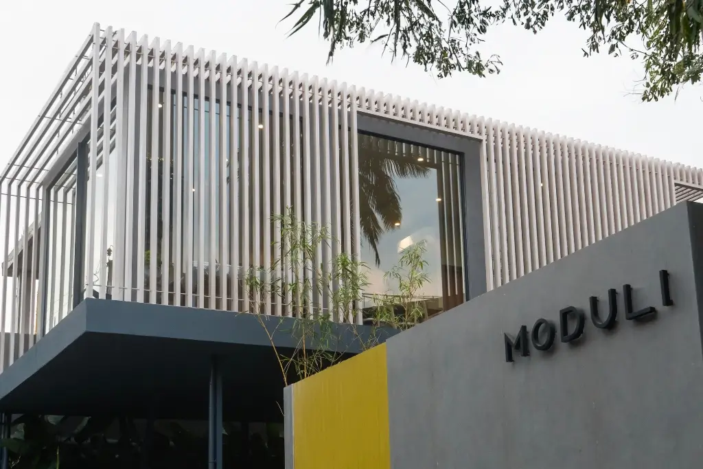 The Moduli Experience Centre in Hyderabad features a striking aluminum rafter façade that blends performance with contemporary design. Vertical fins wrap the structure, filtering sunlight, enhancing privacy, and creating dynamic light and shadow throughout the day. Elevated above a solid base, the modular form expresses clarity, lightness, and modern architectural identity.