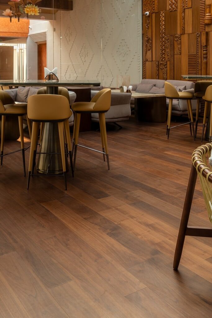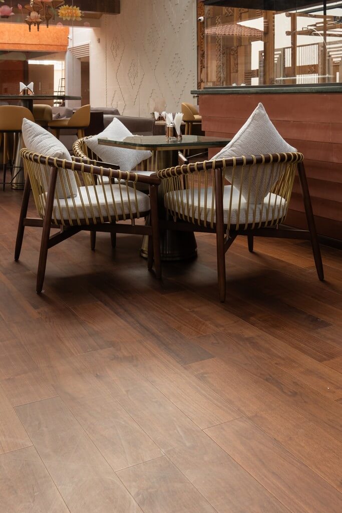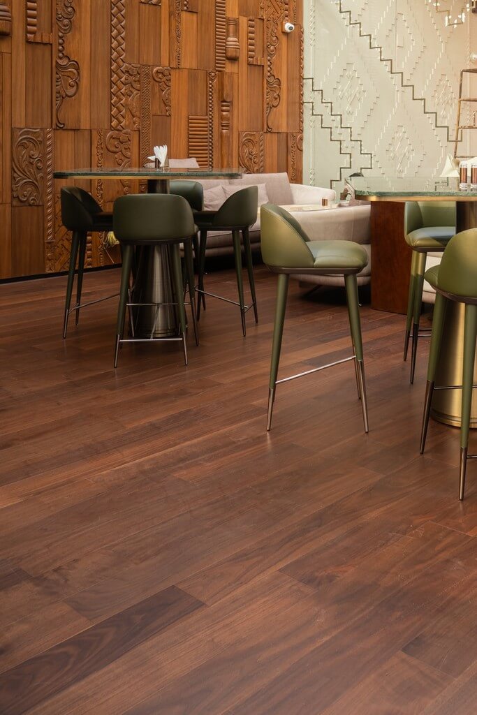 Inside, rich American Walnut engineered flooring adds wamth, elegance, and long-term performance to the bustling café space.