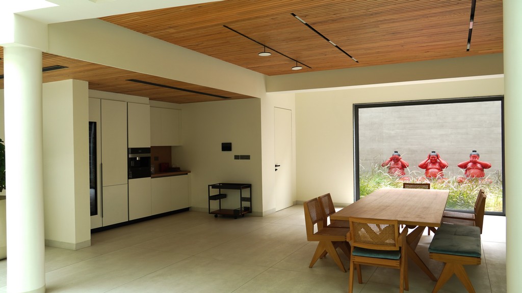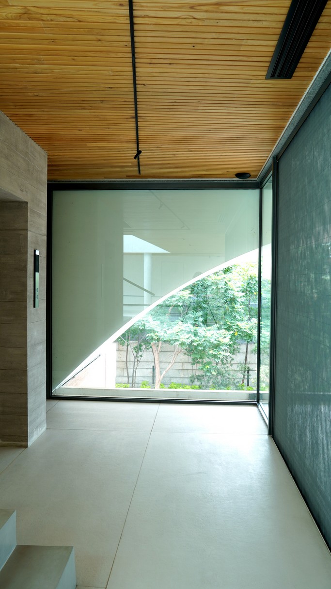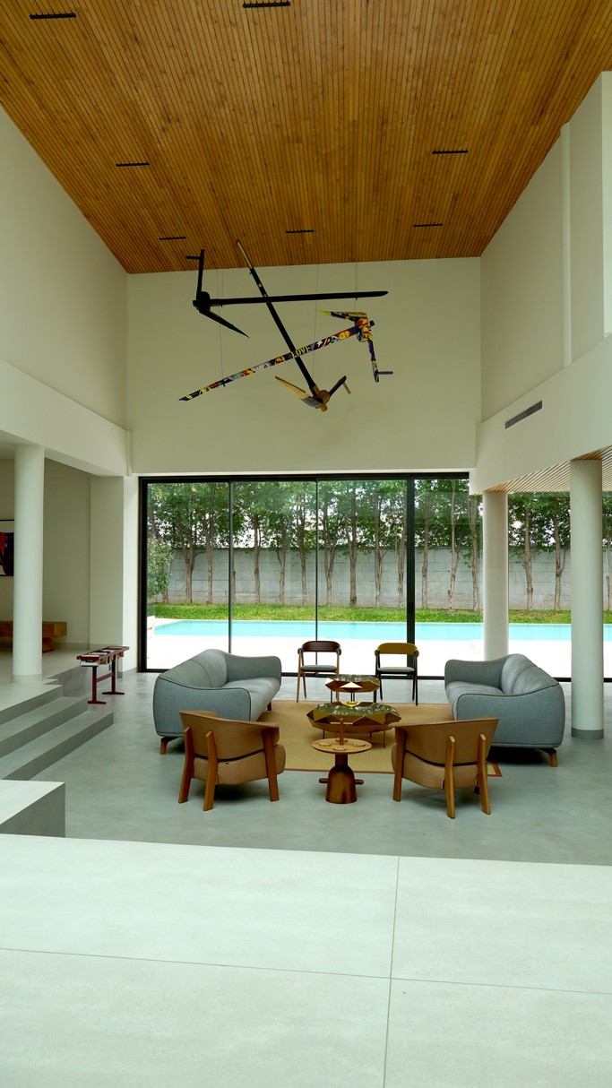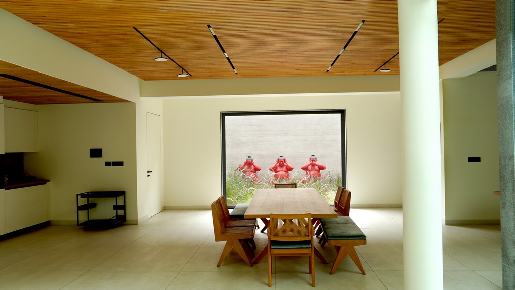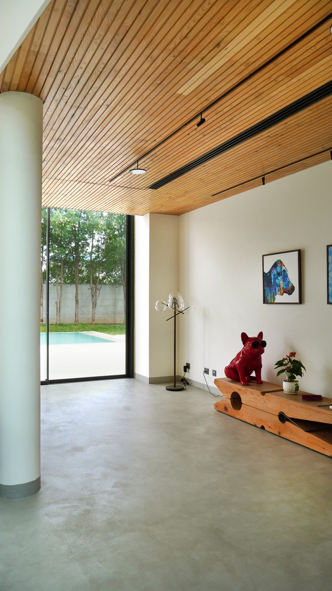 This residence in Banjara Hills features White Ash wood cladding that seamlessly extends across walls and ceilings, creating a cohesive and immersive architectural statement. The fine grain pattern and warm natural tones of White Ash introduce texture and rhythm, enhancing the spatial volume while maintaining a refined, contemporary aesthetic.